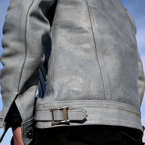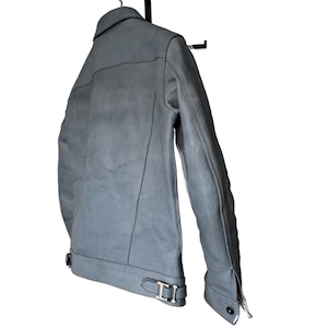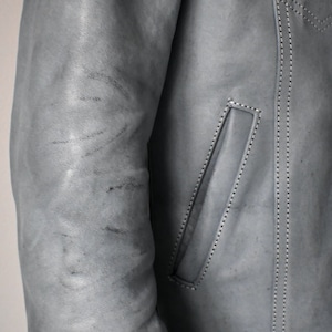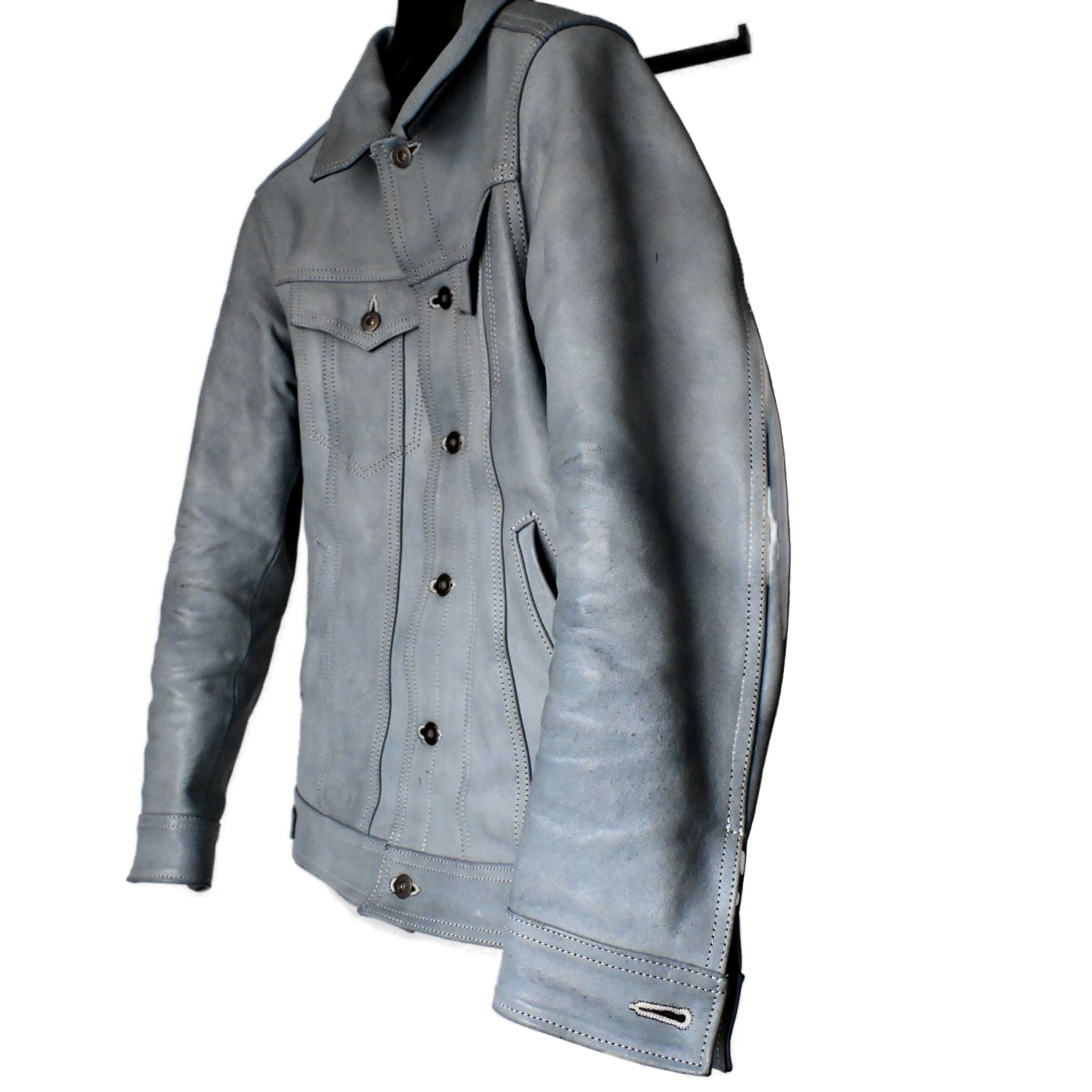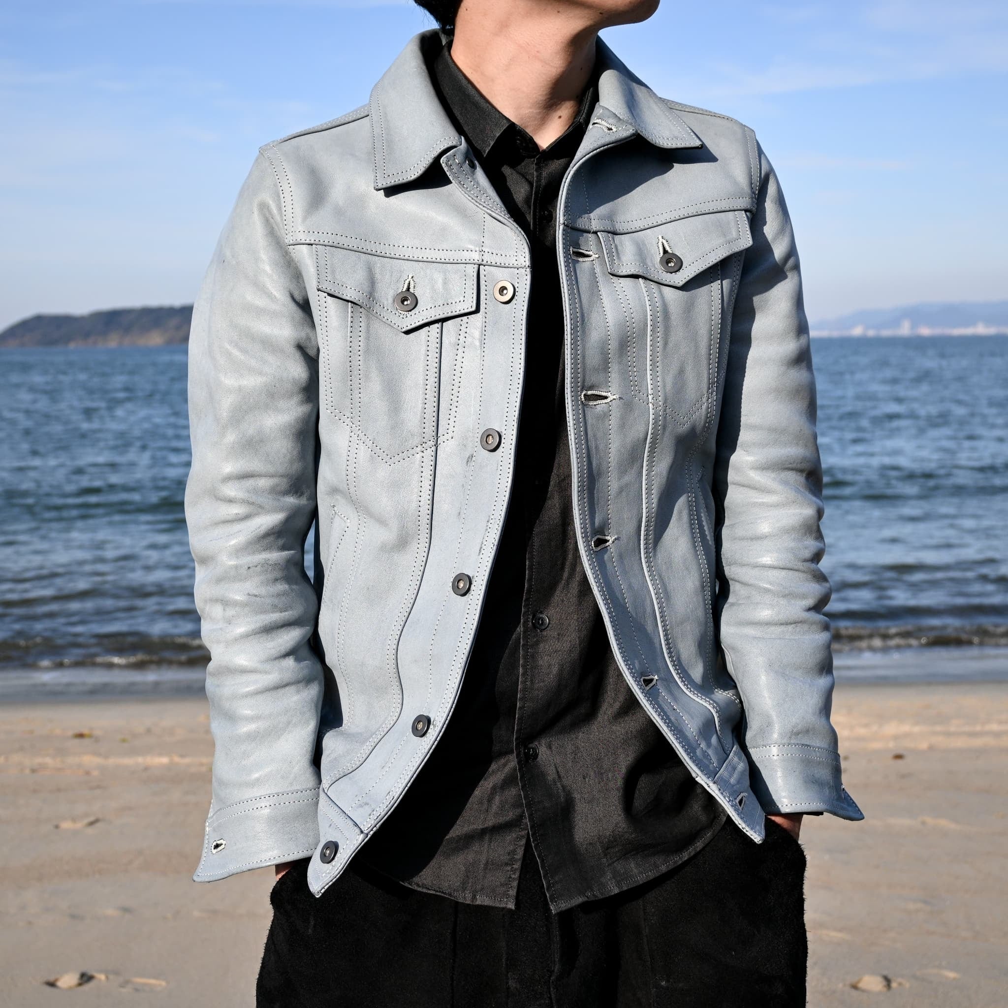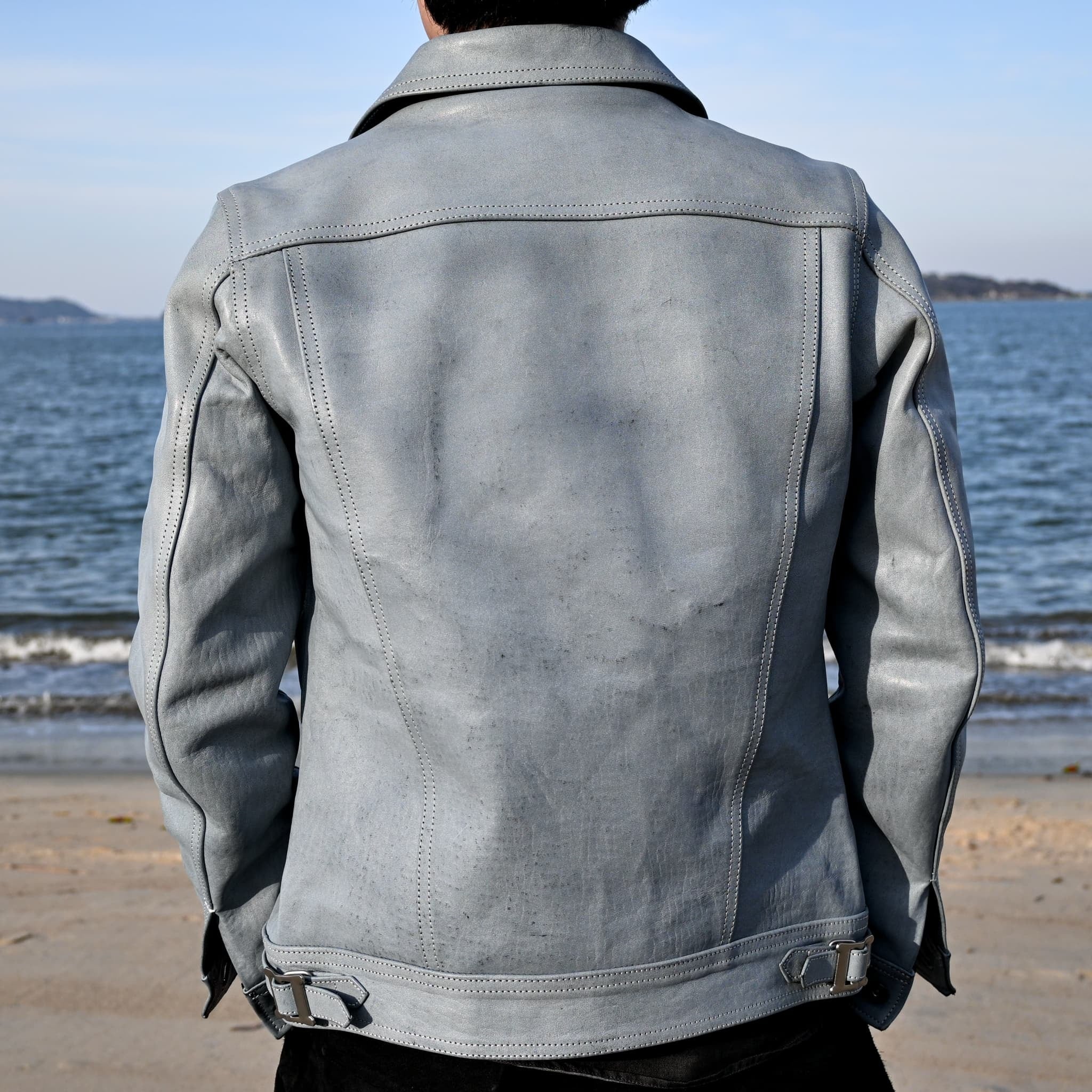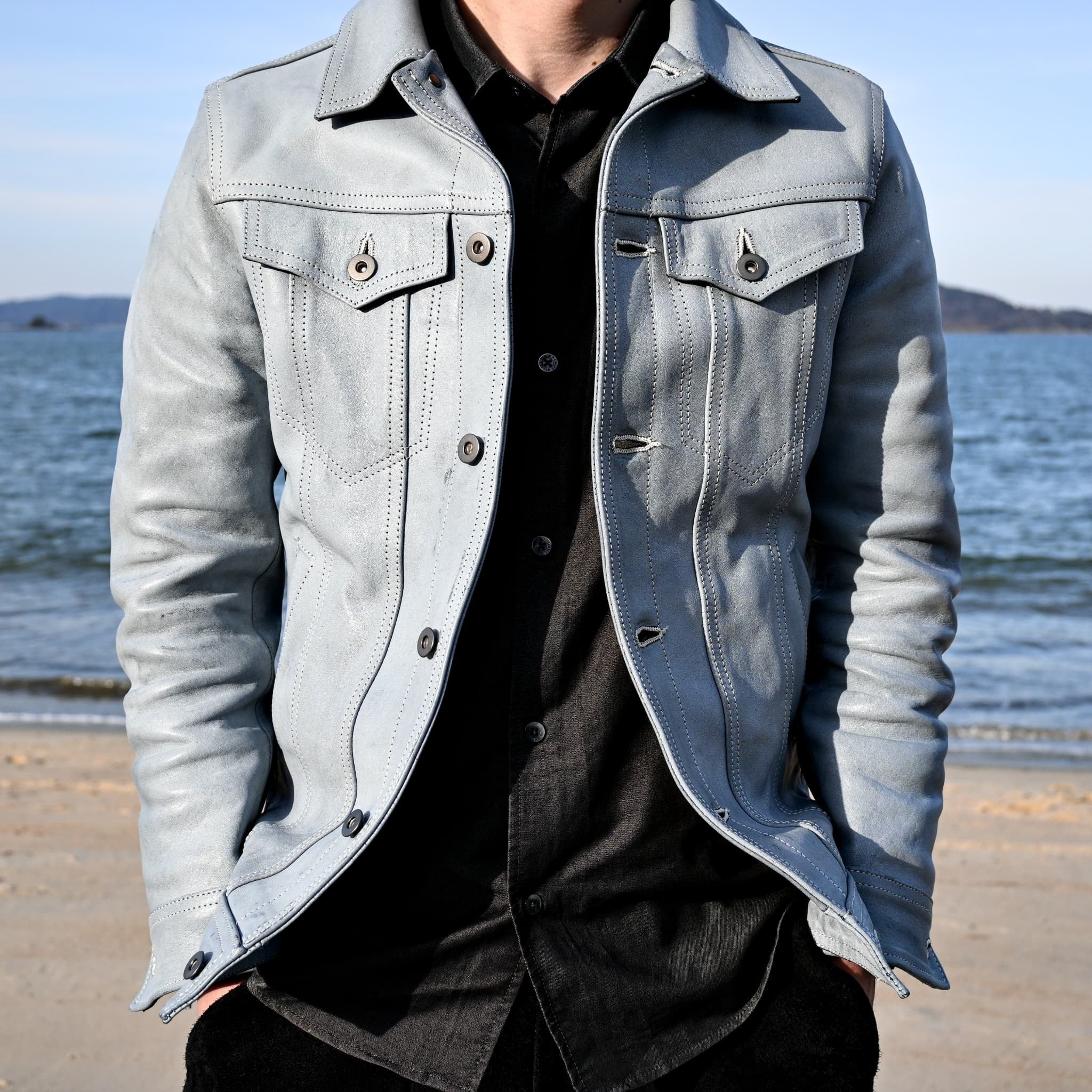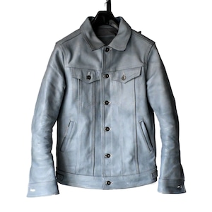 パッと見では、ベーシックなトラッカージャケットに見えても細かな部分で革ジャンとしてのアイデンティティを感じられる一着に仕上げております。